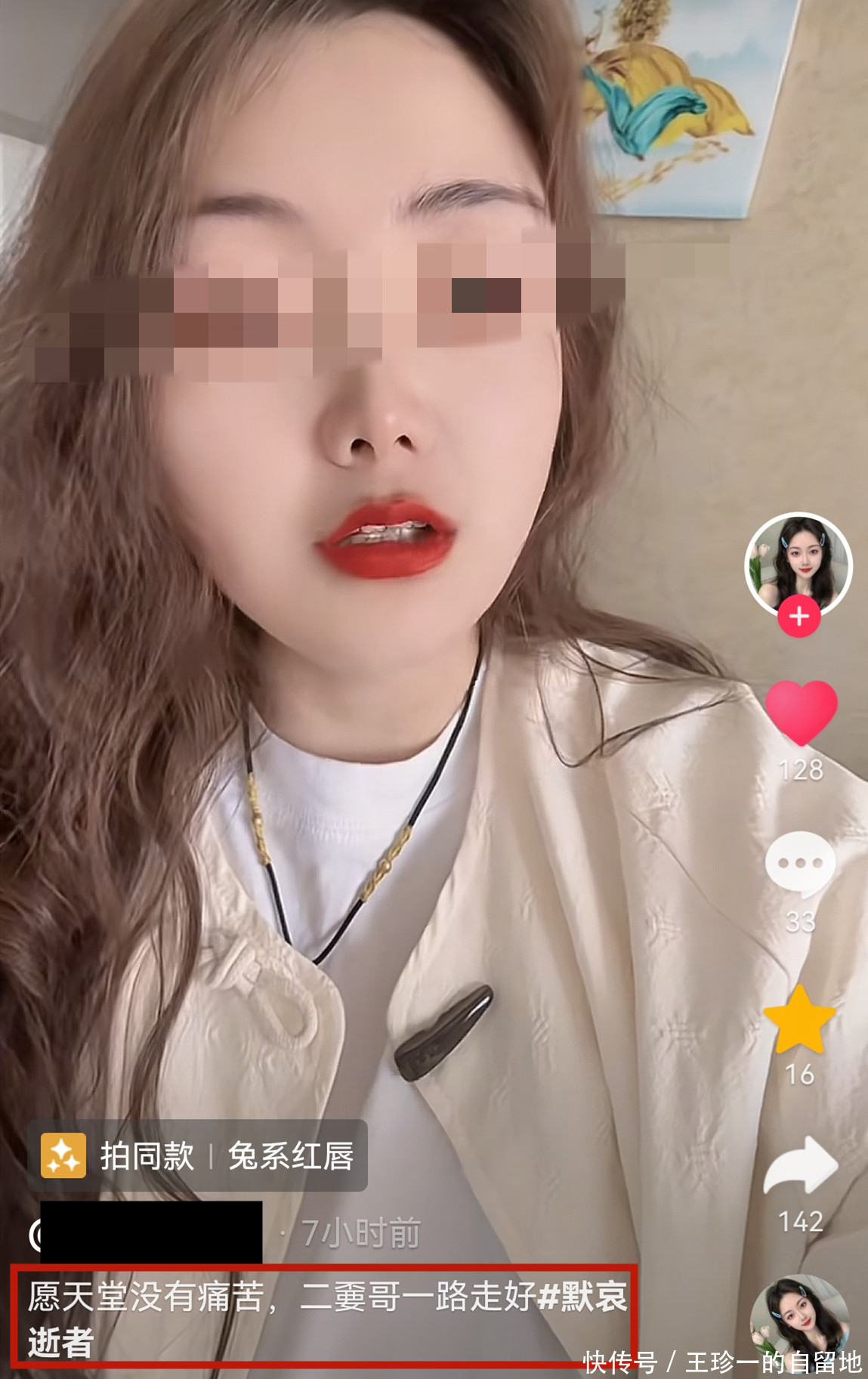 3月29日下午1点多,一位与二嫑哥合作过的女网友在社交平台发视频悼念二嫑哥,她写道:愿天堂没有痛苦,二嫑哥一路走好。