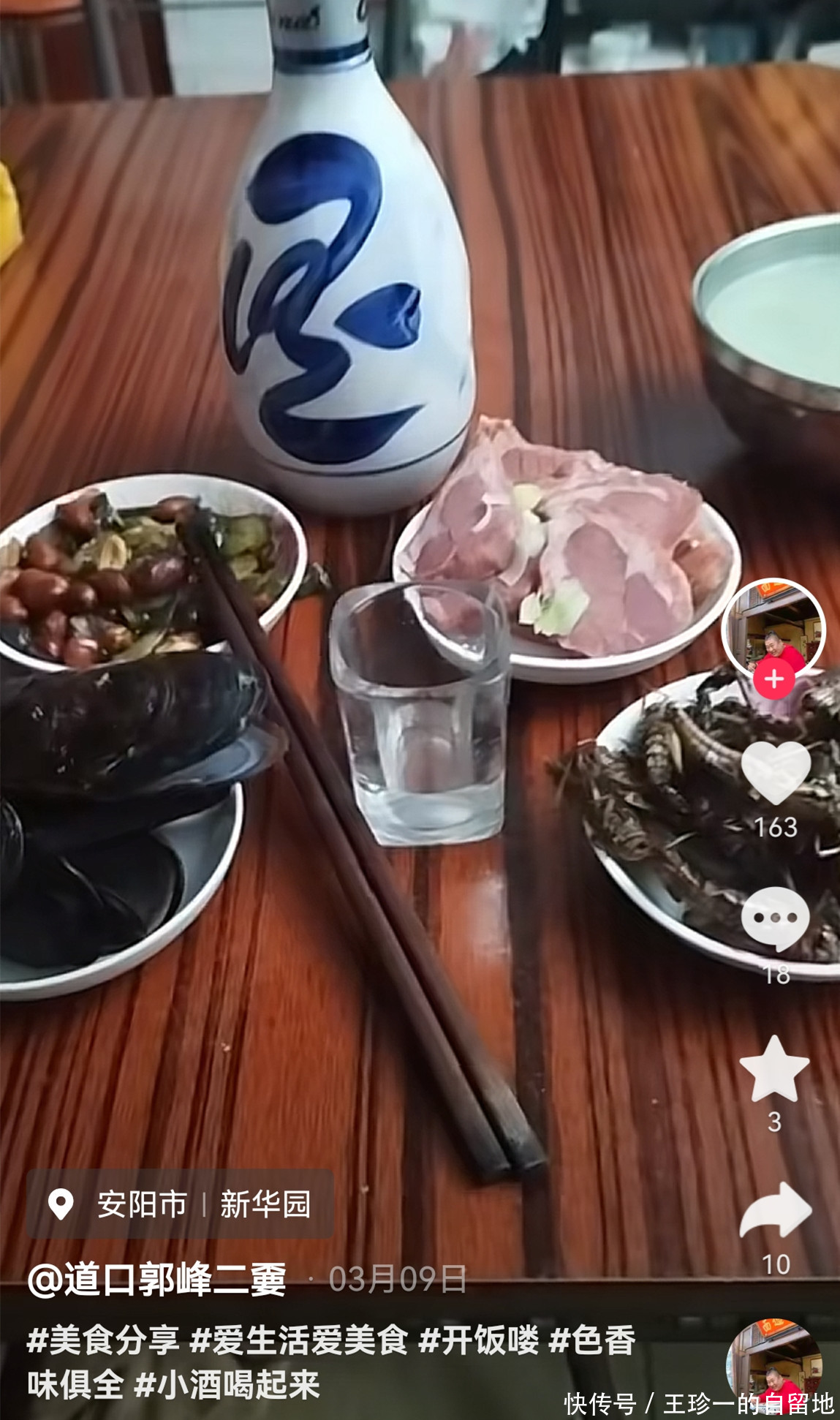 从视频中可以看到桌子上摆满了食物和酒,他一边拍摄一边介绍有哪些食物,他说有海虹、牛肉、黄瓜泡花生、炸蚂蚱。他还为这段视频贴上了“爱生活爱美食”的标签。