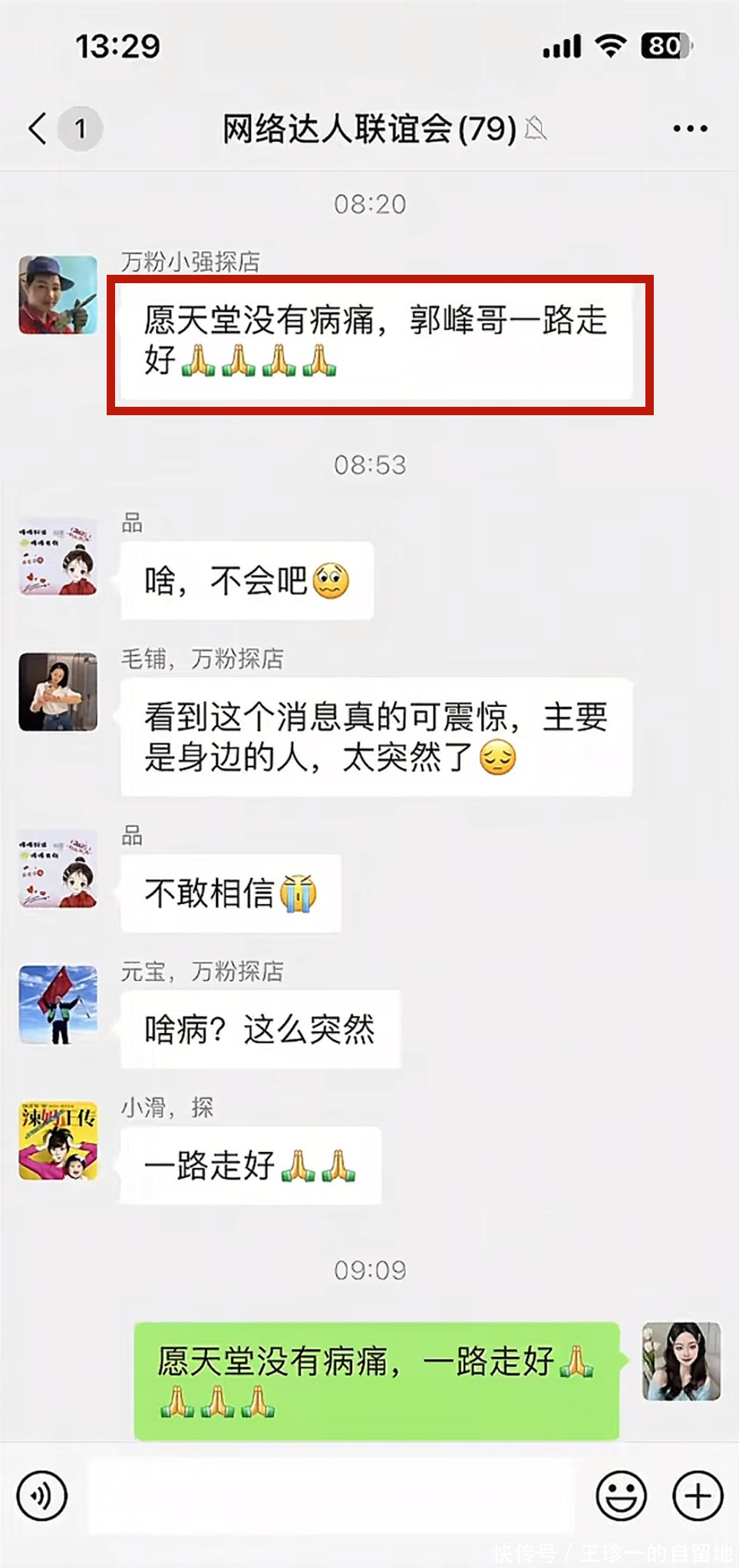 从截图中可以看到,早上8点多,一位群成员发文:愿天堂没有病痛,郭峰哥一路走好。